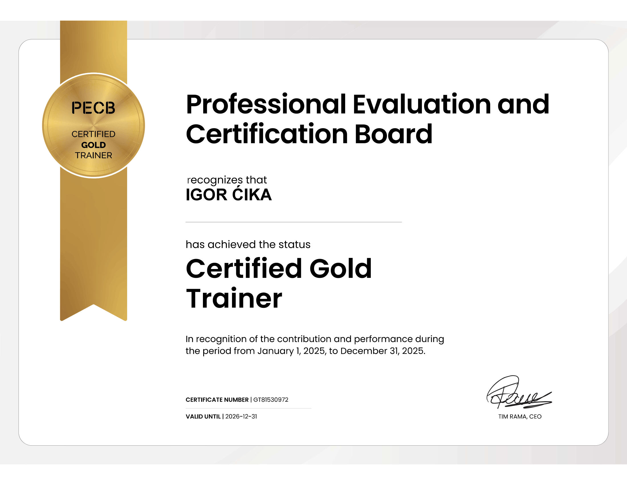 Akreditovani ekspert – trener od strane PECB (Professional Evaluation and Certification Board, Kanada) i sa više od 200 treninga u oblasti sistema mendžmenta, bezbednosti informacija, procene rizika i zaštiti podataka, ovlašćeni konsultant European Bank for Reconstruction and Development (EBRD) i Deustche Gesellschaft fur Internationale Zusammenarbeit (GIZ) i član Srpske asocijacije menadžera korporativne bezbednosti (SAMKB)